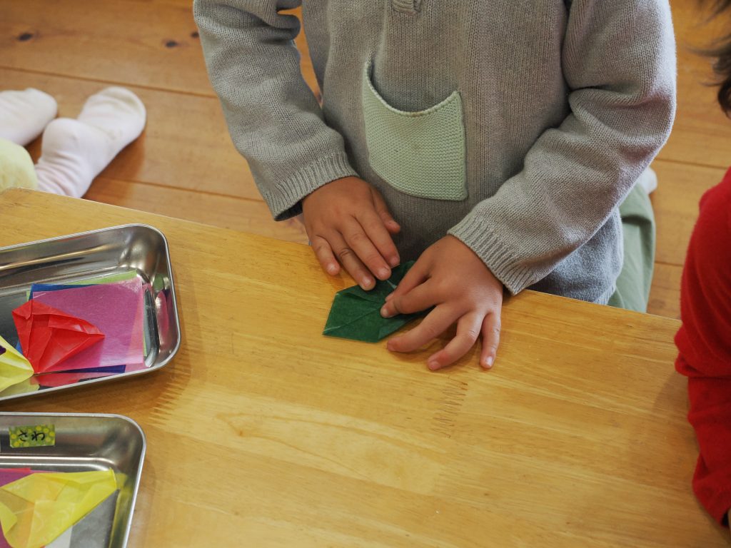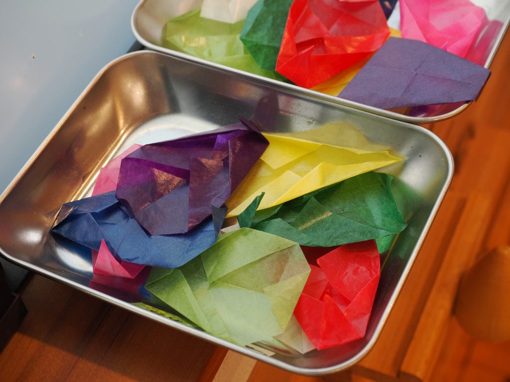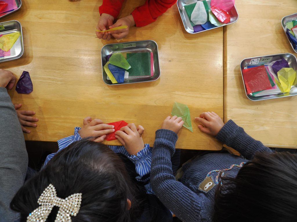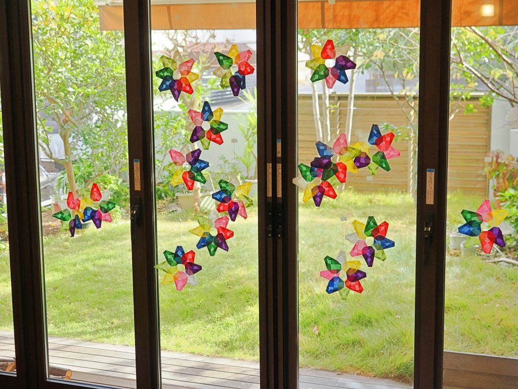 この時期にはトランスパレントペーパーを同じように折って張り合わせ、窓飾りを作ります。