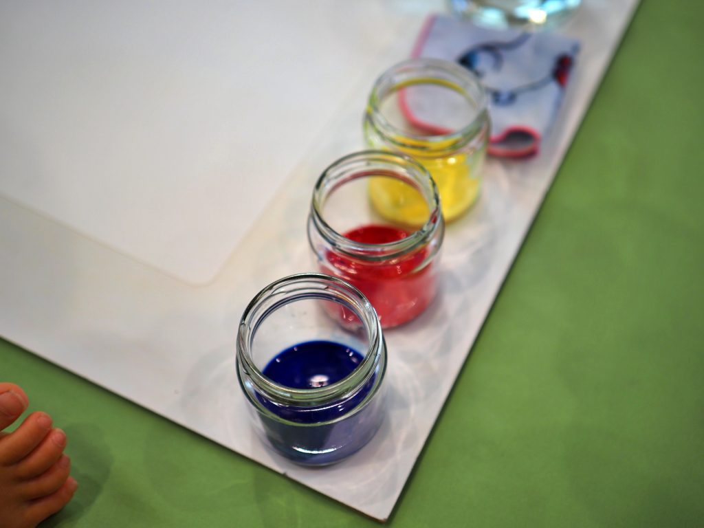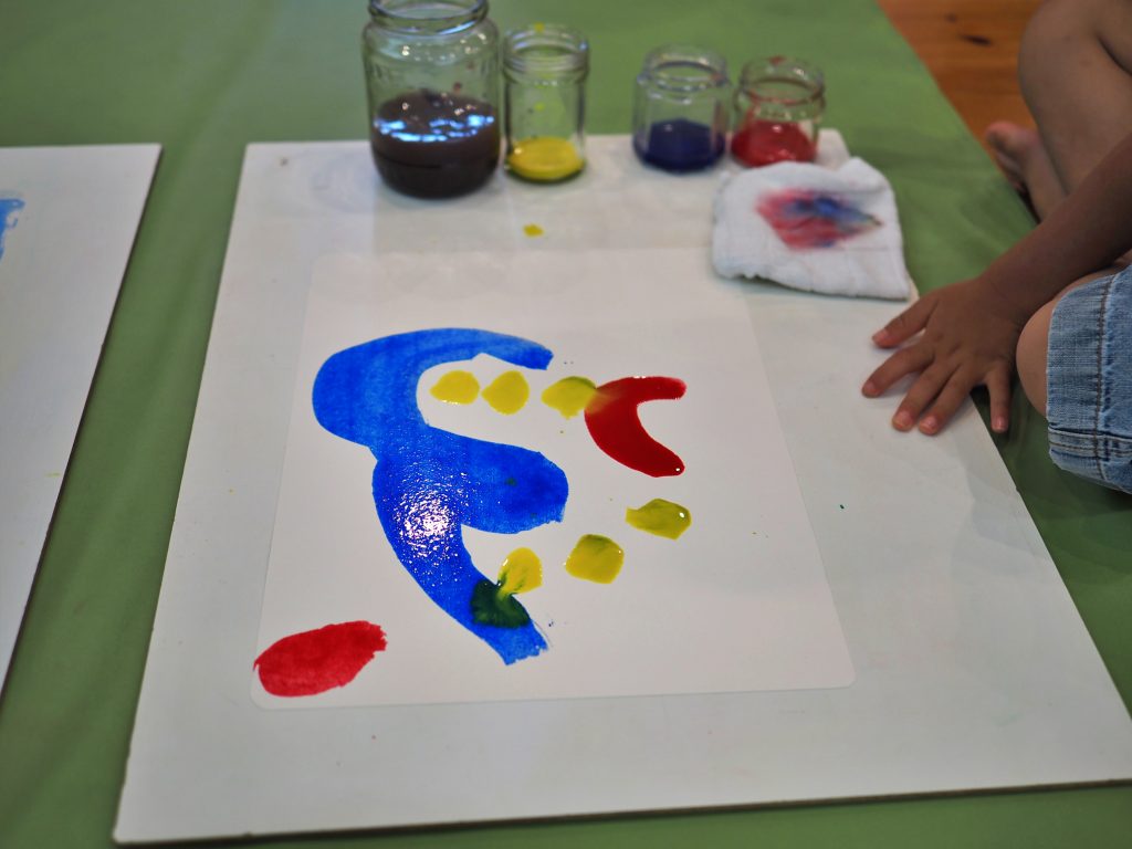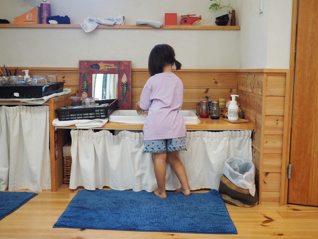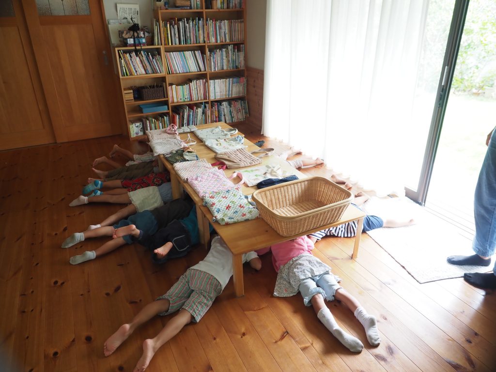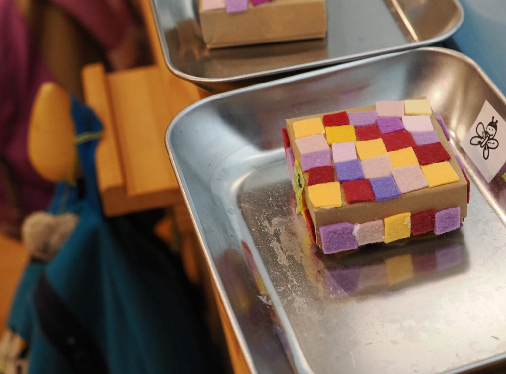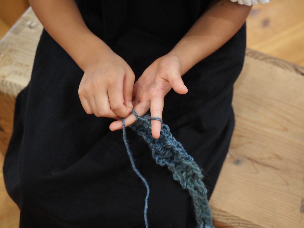 フェルトを箱に張って、色合いを楽しんでみたり、濡らし絵をしたり、自由遊びの時間を楽しんだりしました。 年長の子は編み物にも関心がでてくるころですね。