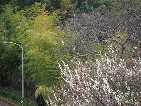 <春> 手前から梅、栗の木、竹林